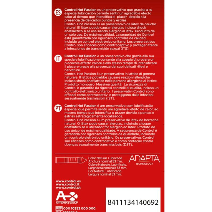 Control Hot Passion es un preservativo que gracias a su especial lubricación permite sentir un agradable efecto calor al tiempo que intensifica el placer debido a la presencia de delicados puntos y estrías.