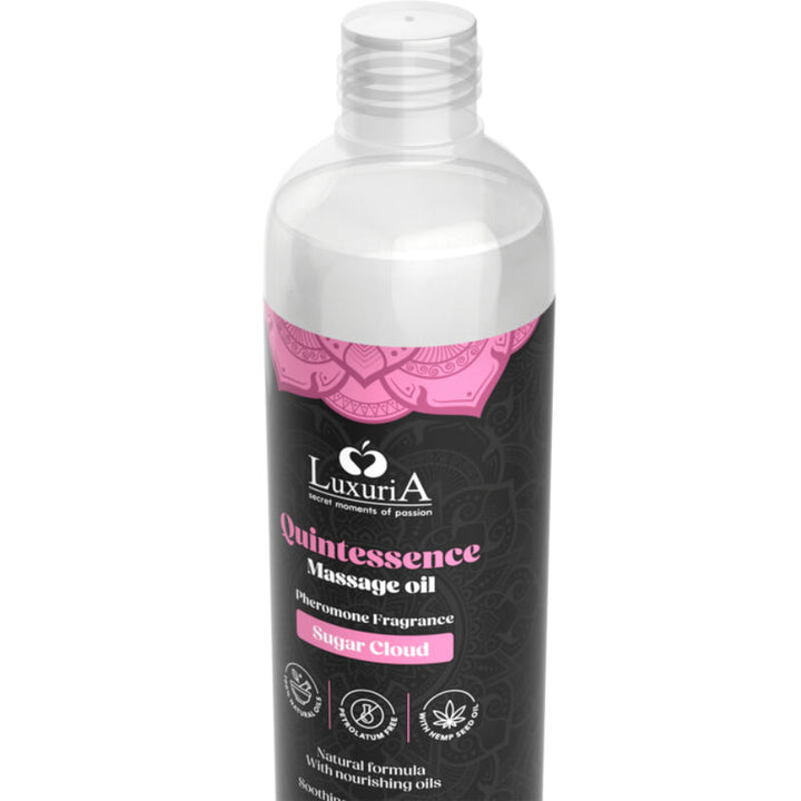 Quintessence Massage Oil, Nube de azúcar. Es un aceite natural y refinado para masajes, enriquecido con formulaciones exclusivas a base de aceites de alta calidad y esencias estimulantes cuidadosamente seleccionadas. Su fórmula nutritiva, elaborada con aceites vegetales completamente naturales, combinada con aromas sensuales, proporciona una hidratación intensa, dejando la piel suave y perfumada. Libre de parafina, el aceite Quintessence Massage Oil respetará y protegerá tu piel gracias a la presencia de aceite de semillas de cáñamo, estimulando tus sentidos con suaves notas de azúcar glas que te acompañarán durante todo el masaje, guiándote hacia la Quintessencia del placer.