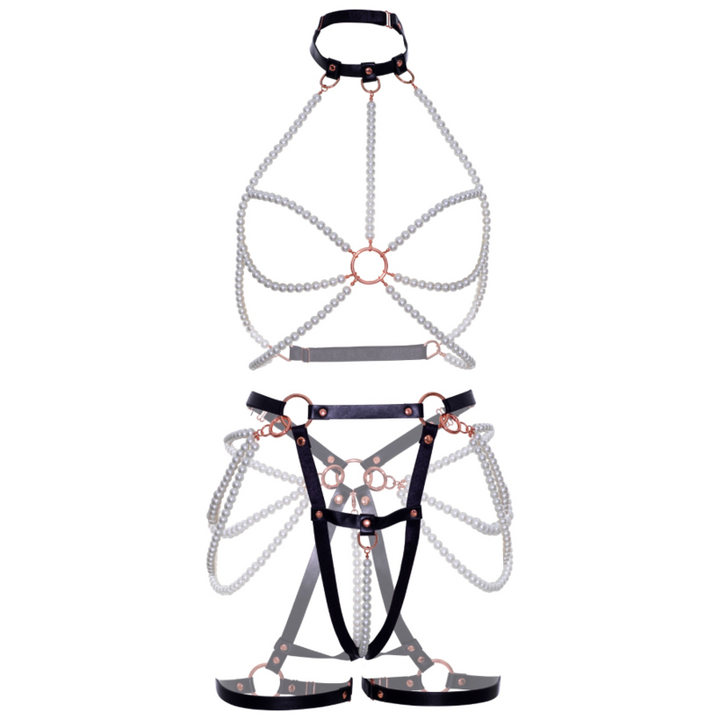 Realce su encanto con nuestro arnés halter de 2 piezas, adornado con perlas artificiales y una pieza central con junta tórica. Hecho de cuero vegano ético, es a la vez moderno y adaptable. El estilo convertible te da la opción de usarlo con o sin la braga desmontable, mostrando atractivos hilos de perlas. Deja que tu gracia interior brille y abraza un toque de refinamiento en cada ocasión.
