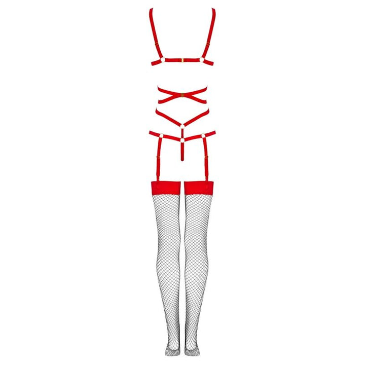 La parte superior del conjunto consta de sexys rayas negras, entrelazadas en el vientre y conectadas con anillos. Los tirantes de la parte superior rodean elegantemente el busto sin cubrirlo, mientras que en la parte inferior se transforman suavemente en un tanga. Tiras individuales corren a ambos lados del tanga, abrazando encantadoramente las caderas. La parte inferior del conjunto se compone de medias negras de largo regulable, confeccionadas en malla. Las medias se sujetan con broches al elemento superior del conjunto, por delante y por detrás.